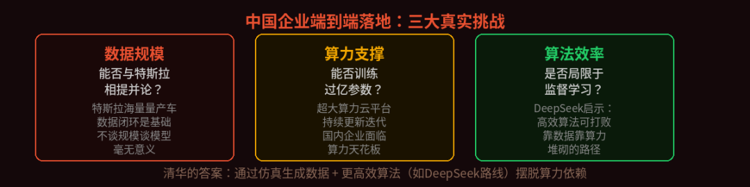Tsinghua's Solutions: Generate data through simulation to address data scarcity; overcome performance limitations through reinforcement learning rather than imitation learning; and break free from computing power dependency through efficient algorithm design. These three points have been Tsinghua's primary research focuses since 2018.