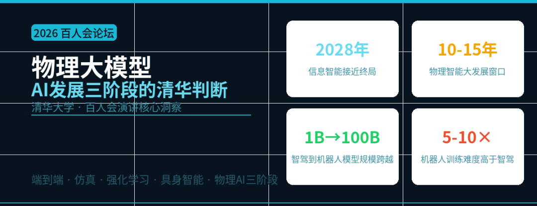 "Physical Intelligence is actually just beginning to flourish now. The next 10 or 15 years will witness a surge of new technologies, methodologies, and companies in this field." — Tsinghua University · 2026 China EV100 Forum