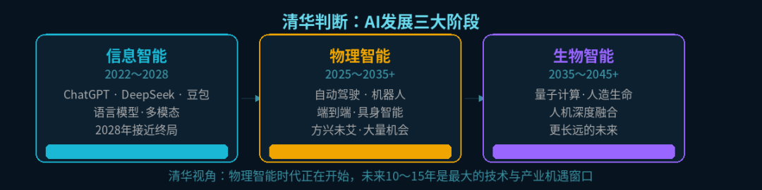 The era of Information Intelligence is expected to reach its zenith around 2028. Meanwhile, the Physical Intelligence era is just dawning, with the next 10 to 15 years offering the most promising window of opportunity. Beyond this period lies the Biological Intelligence era, characterized by profound human-machine integration.