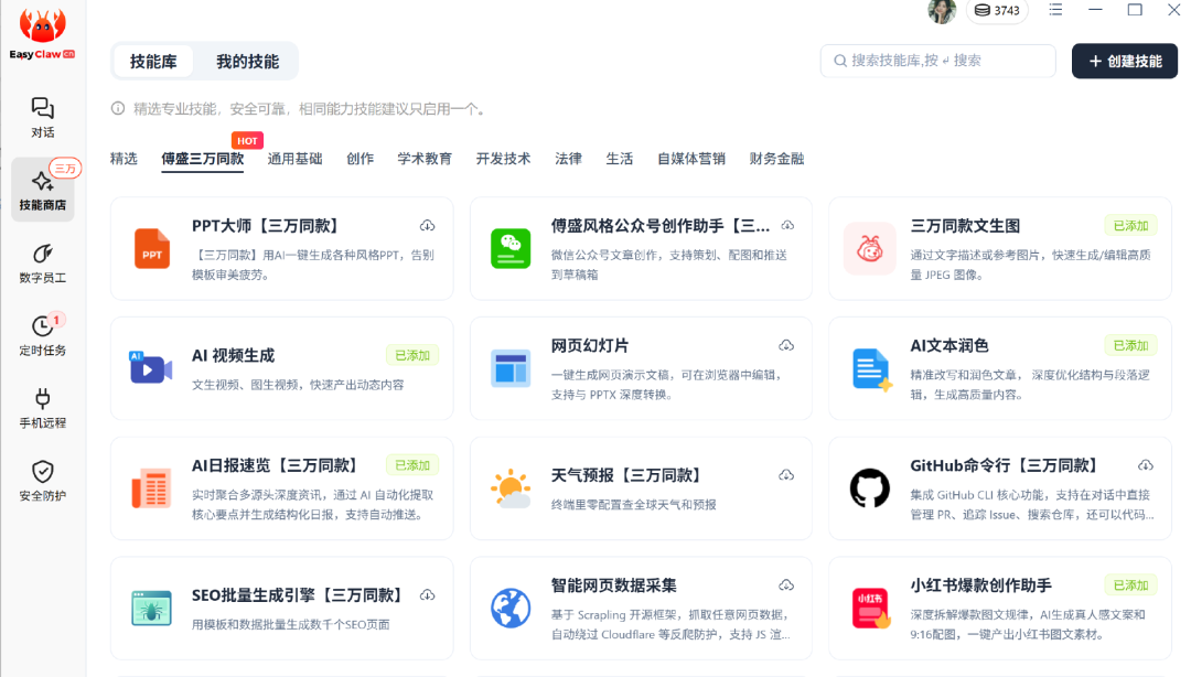 Example: EasyClaw's Skill store also highlights skills used by Fu Sheng's version of crayfish.