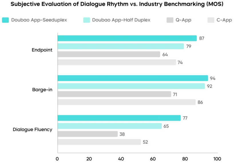 Test data indicates that compared to the previous generation half-duplex Doubao end-to-end voice model, Seeduplex improved pause detection MOS scores by 8% and conversational fluency MOS scores by 12%.
