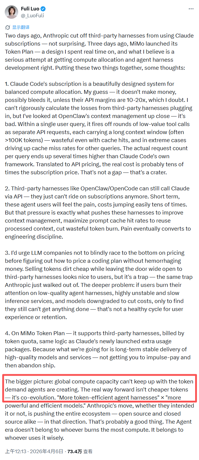 The new competition in the token economy has become nuanced to the point of 'who can make each token yield higher value.' Luo Fuli wrote at the end of her post, which has garnered over 730,000 views, that the true way forward lies not in cheaper tokens but in the co-evolution of models and Agents.
