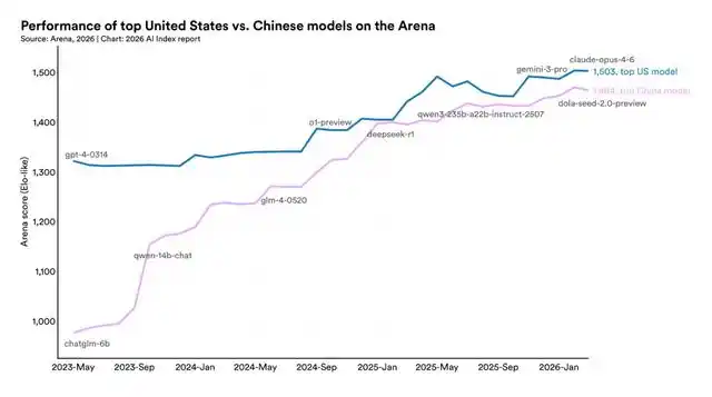 On the same day, Stanford HAI released its 2026 AI Index report, indicating that the performance gap between the leading AI models from China and the US had narrowed to just 2.7%.