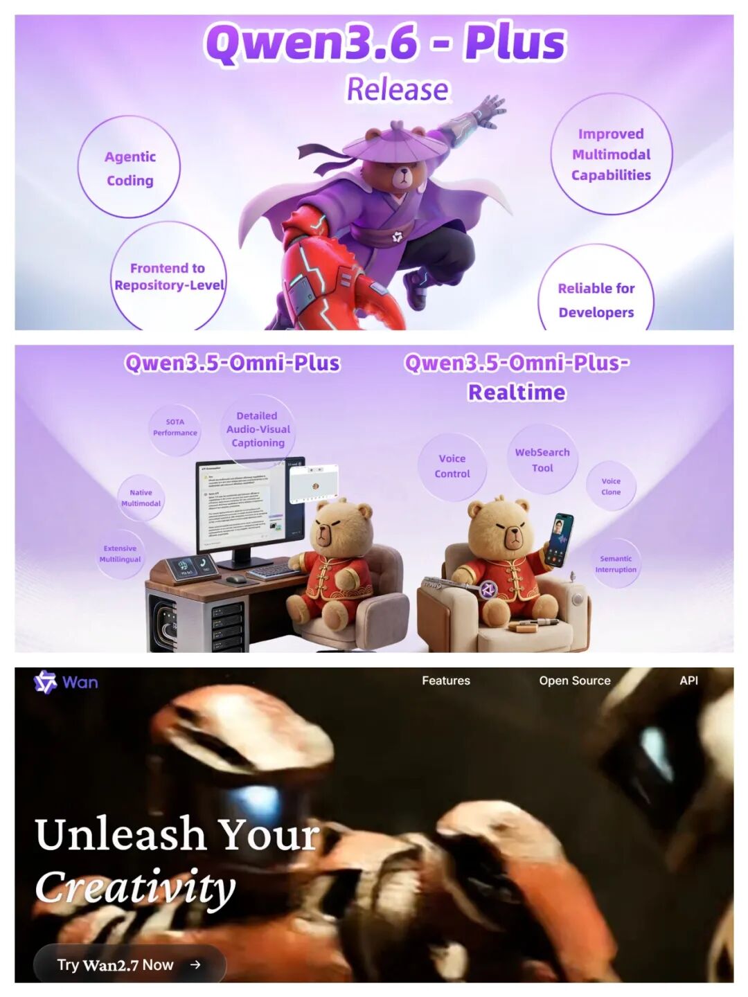 Node AI discovered that amid these two strategic shifts, Tongyi Lab released three flagship models in four days: Qwen3.5-Omni (a full-modality interaction model), Wan2.7-Image (a visual generation model), and Qwen3.6-Plus (a large language model), covering full-modality understanding, image generation, and programming intelligence—three critical capability areas.