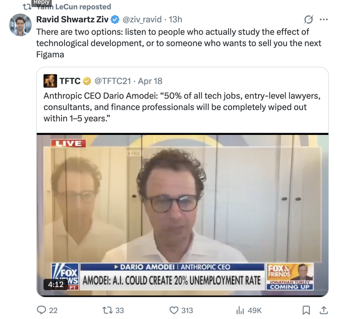 LeCun is self-aware. His X post's most-shared line was 'don't listen to me.' Not out of humility, but to say AI insiders, including himself, aren't authorities on employment. If he just said 'don't listen to Dario,' the reply would be 'you're in AI too.'