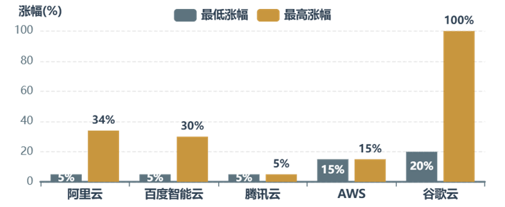 In the cloud, from March to April, top Chinese cloud vendors raised prices, breaking long-term low-price competition. Alibaba Cloud's AI compute products rose up to 34% starting April 18, with high-performance storage up 30%; Baidu Smart Cloud increased AI compute products by 5%-30%; Tencent Cloud raised AI compute products by 5% starting May 9. Globally, AWS hiked machine learning instance prices ~15% in January, while Google Cloud made minor adjustments.