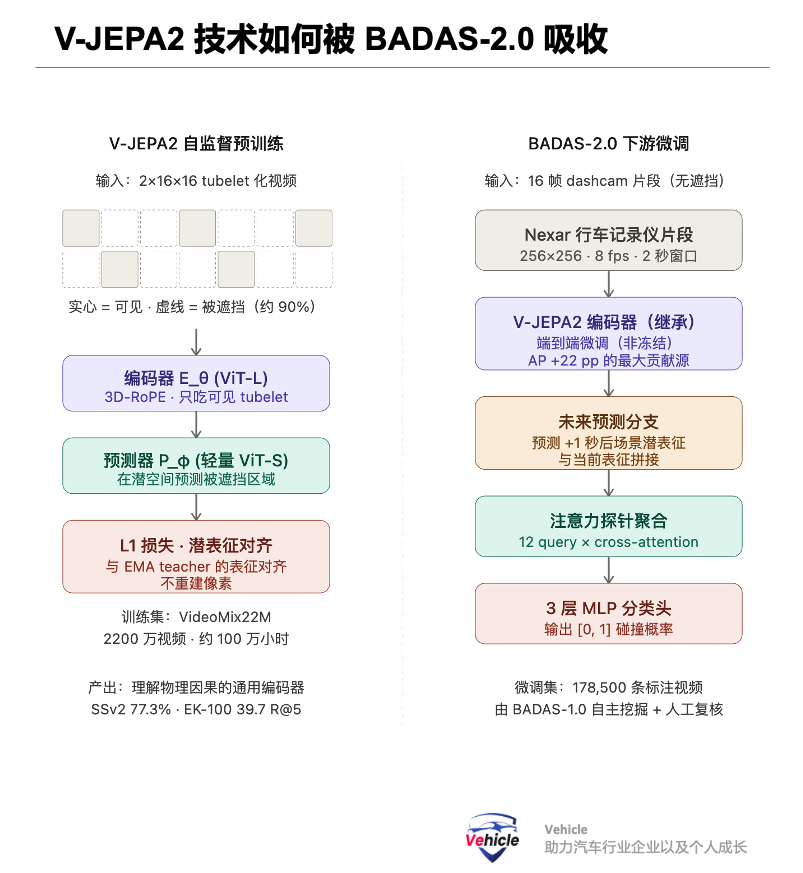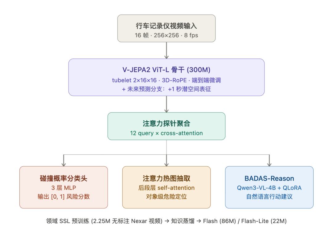 BADAS (Based on V-JEPA2 Advanced Driver Assistance System) is the second-generation "collision anticipation" model family launched by Nexar AI. It identifies collision risks through a world model and then provides interpretable and interactive alerts via a Visual Language Model (VLM).