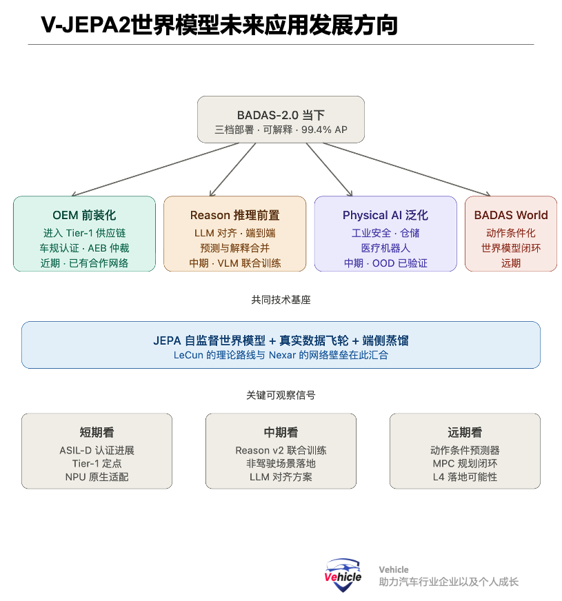 3. Generalization of Physical AI. Nexar's official press release explicitly mentions that BADAS-2.0 can still make stable predictions in out-of-distribution (OOD) non-driving physical collision scenarios. This implies that the paradigm of "JEPA architecture + large-scale real-world edge data + distillation" can be transferred to safety-critical fields such as industrial safety, warehousing and logistics, and medical robots, rather than being limited to autonomous driving.