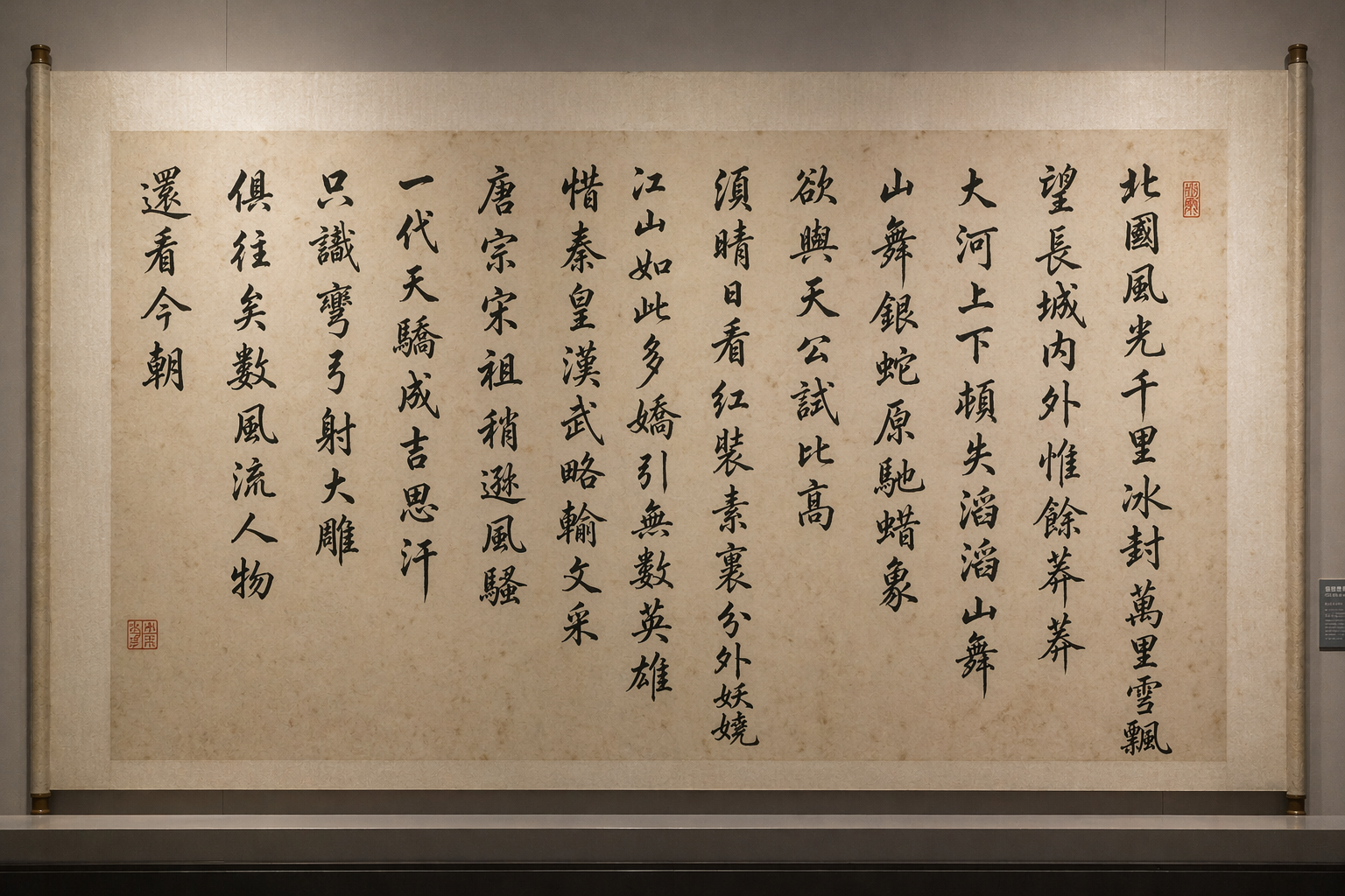 Generate a photo-style image: A piece of calligraphy is on display in a museum, inscribed with the following text: "The northern lands stretch, a thousand li of ice bound, ten thousand li of snow drifting. Beyond the Great Wall, only endless white remains; above and below the great river, the surging waters suddenly fall silent. Mountains dance like silver serpents, the plains gallop like waxed elephants, vying with the heavens for height. On a clear day, see the red and white adornments, especially enchanting. Such a landscape is so charming, it has bent the wills of countless heroes. Alas, Qin Shi Huang and Han Wu Di, slightly lacking in literary grace; Tang Tai Zong and Song Tai Zu, somewhat inferior in poetic flair. A heavenly proud figure of a generation, Genghis Khan, only knew how to shoot eagles with a bow. All have passed; to see the remarkable figures of today, look no further."