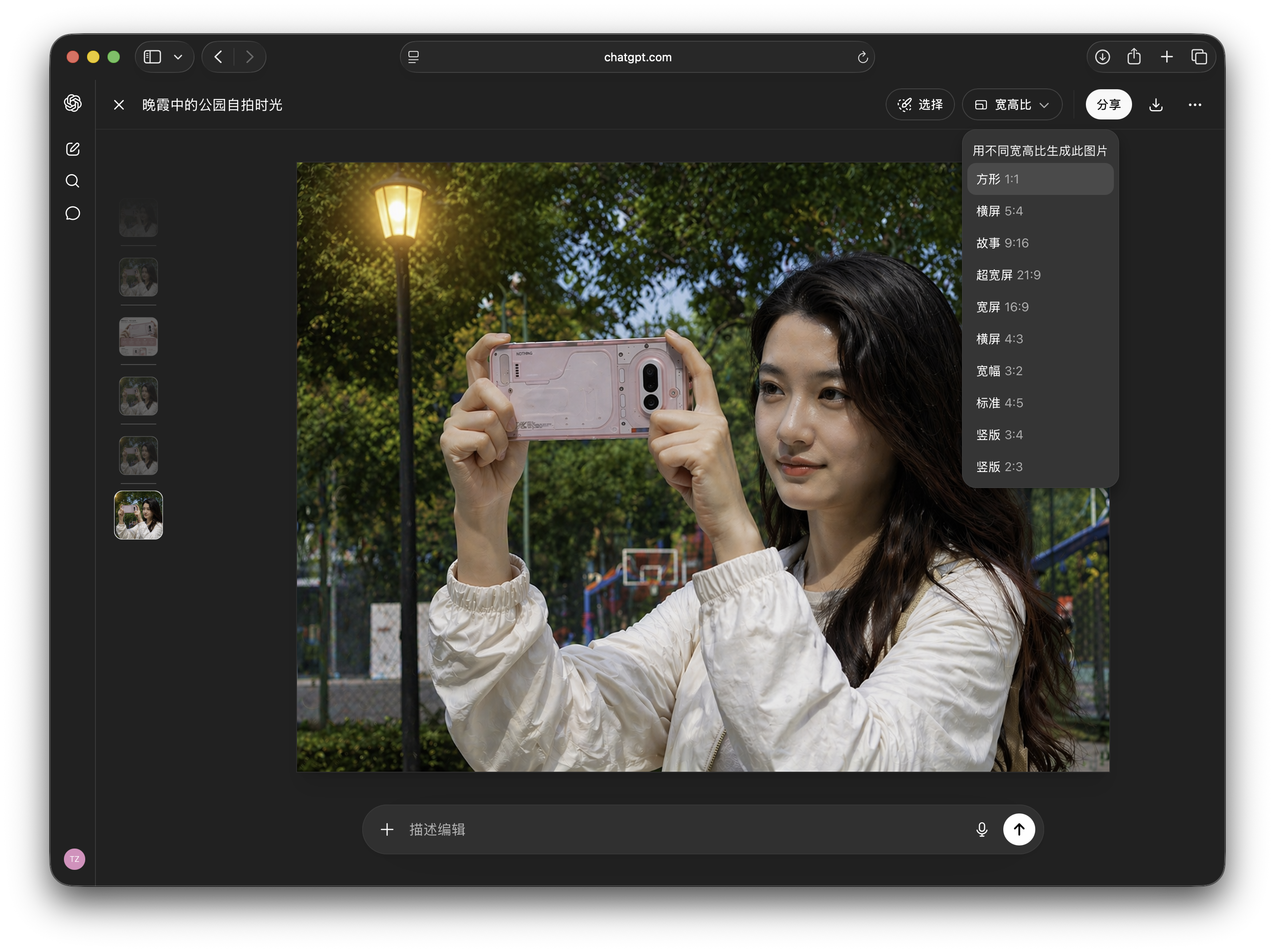 In the brand-new image viewing interface, ChatGPT has also introduced two innovative features—we can directly select areas of the image that require modification and request ChatGPT to make changes, or we can choose the desired image aspect ratio from the aspect ratio menu, making it even more convenient to create images for social media.