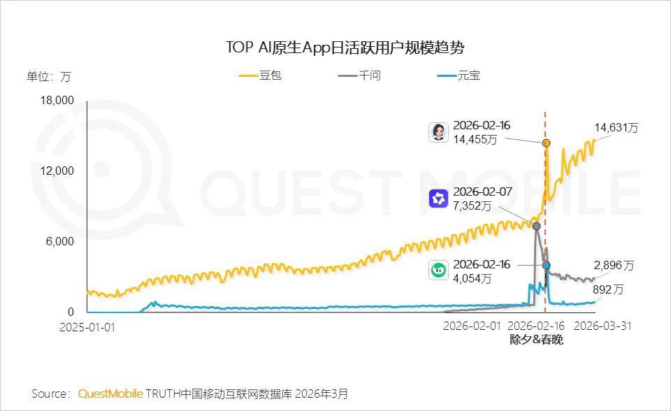 During the Spring Festival, Qianwen's user base surged but immediately declined afterward, while Doubao's daily active users continued to rise. QuestMobile data shows that after the Spring Festival peak, Doubao's DAU stabilized around 140 million, compared to Qianwen's 30 million and Yuanbao's 9 million.