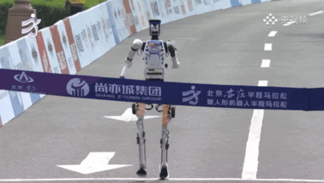 A humanoid robot suddenly turns and runs into the crowd as it nears the finish line.