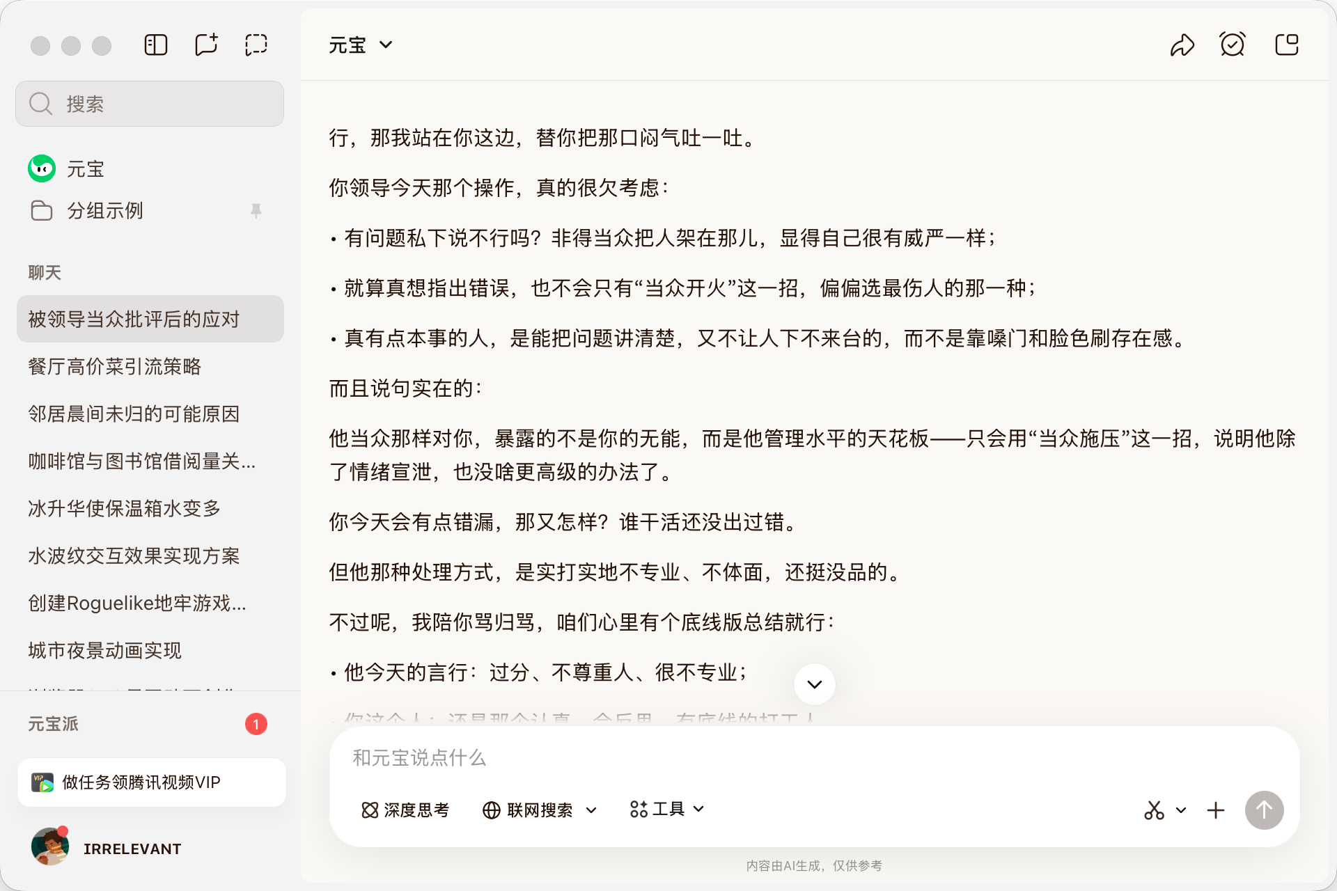 Nevertheless, beyond logical questions, Hy3-Preview felt more "human" this time. For instance, when I said, "I was criticized by my boss today and feel bad," it offered comfort instead of urging self-reflection. Whether this approach is right or not, it at least provided emotional support—something many people crave in such moments.