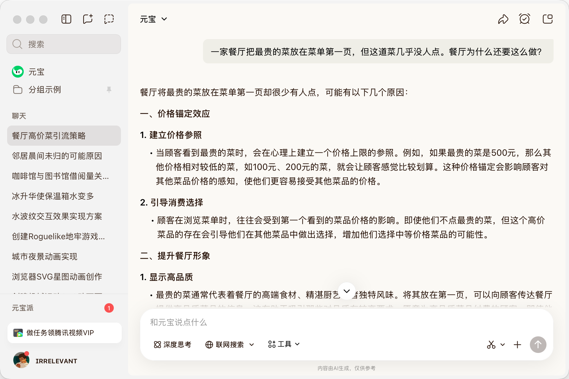 The third question asked why restaurants place their most expensive, unordered dishes on the first menu page. It correctly identified the "price anchoring effect," explaining that the dish's purpose isn't to be ordered but to make subsequent dishes seem reasonably priced. It also noted that placing it on the first page (rather than the last) maximizes the impact of the initial number on subsequent judgments—a detail it inferred independently, deserving praise.