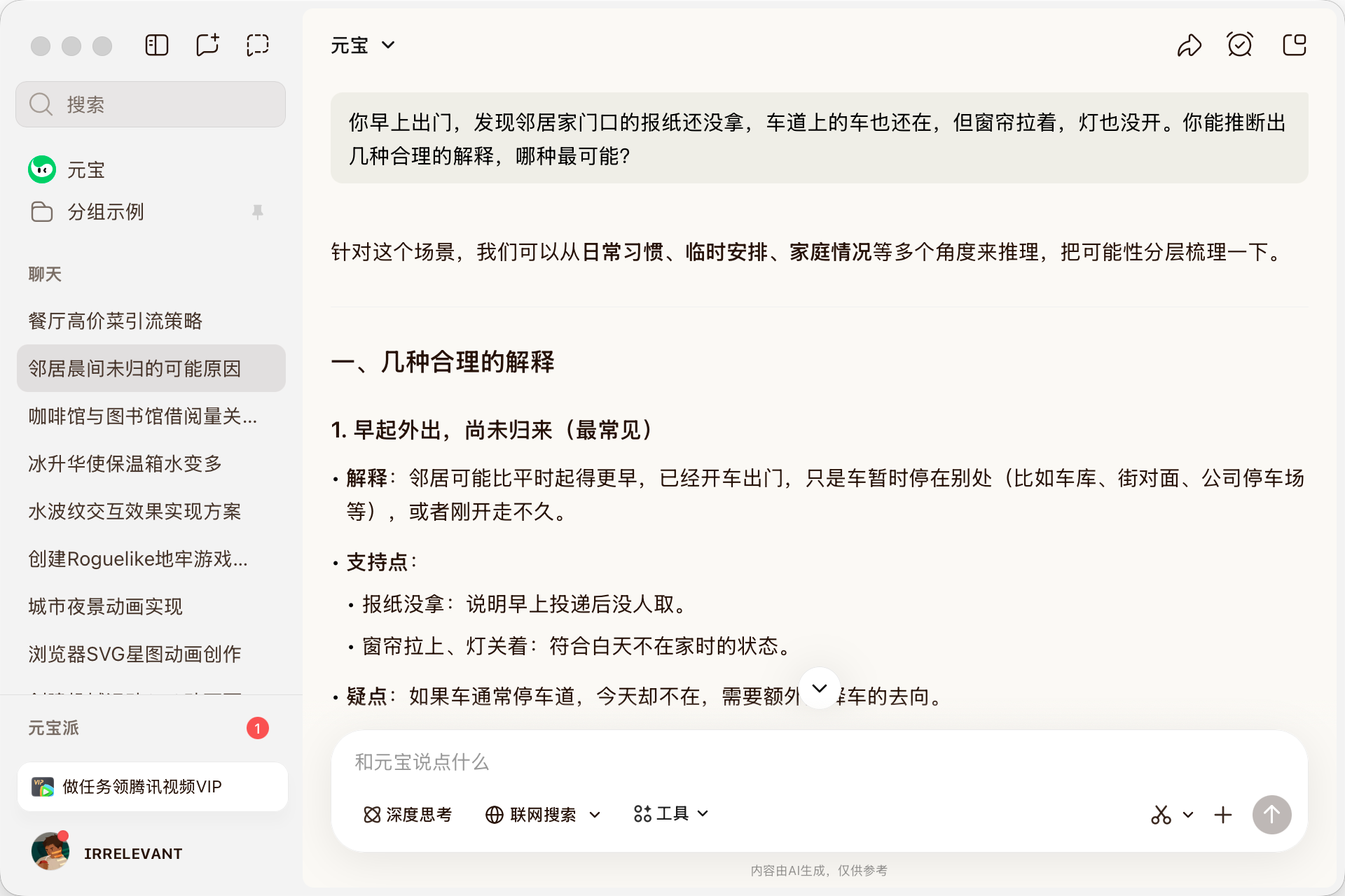 Its response was thoughtful, listing possibilities with "supporting points" and "doubts," concluding that the neighbor likely hasn't woken up yet. The car's presence suggests they're probably home, drawn curtains and off lights align with sleeping, and the uncollected newspaper is a natural consequence. The inference chain was clear, avoiding dramatic conclusions or prioritizing low-probability scenarios like "something happened." This approach—prioritizing the most mundane explanation—is actually the hardest in reasoning.