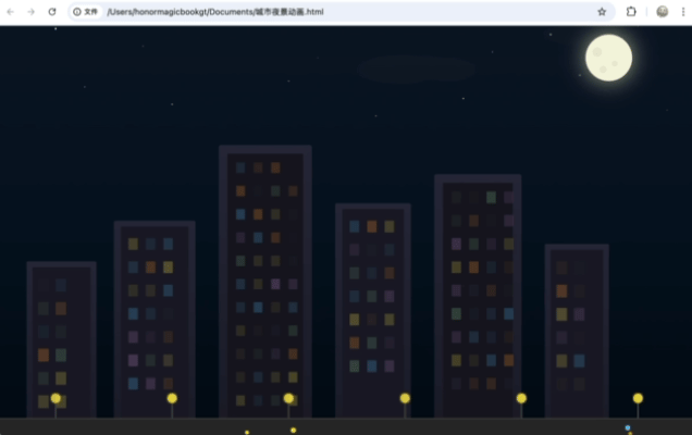 Next, we tasked it with creating a city nightscape SVG animation. This time, it fulfilled all requirements: layered buildings, randomly flickering windows, moving car lights, and double-flash lightning effects, with particular attention to the flickering windows.