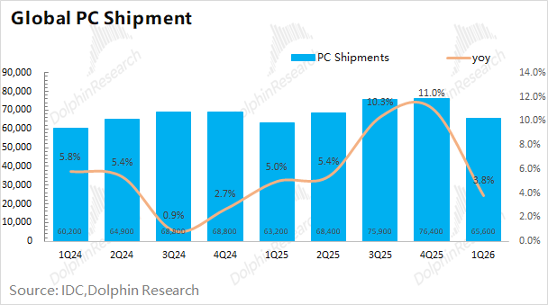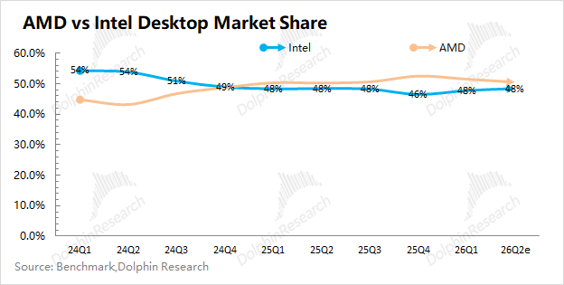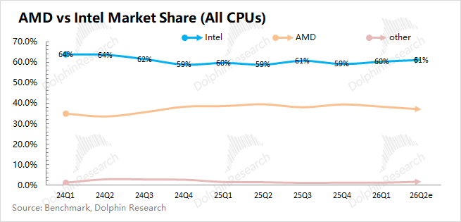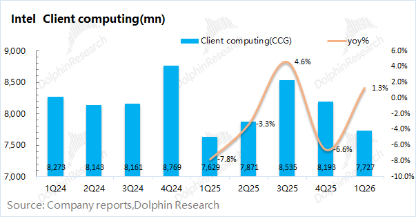 According to IDC industry data, global PC shipments totaled 65.6 million units in this quarter, up 3.8% year-over-year. Despite this growth, factors such as rising memory prices and reduced government subsidies have kept the industry relatively sluggish. In comparison, Intel's client revenue grew by only 1.3% year-over-year, indicating a continued loss of market share in the PC segment. Notably, AMD has surpassed Intel in the desktop CPU market.