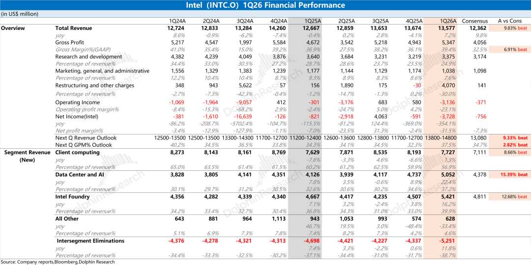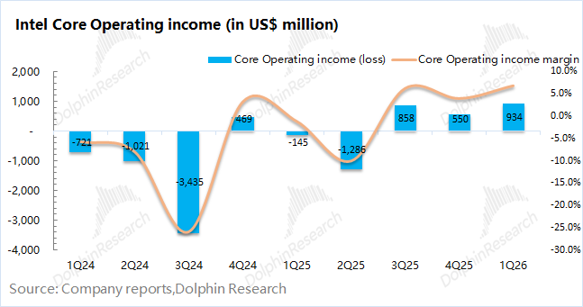 1.4 Net Profit: Intel reported a net loss of $3.73 billion in the first quarter of 2026. From an operating perspective, the company's core operating profit for this quarter was approximately $930 million, better reflecting the company's true operating conditions. The sequential improvement in core profit this quarter was mainly driven by server CPU price hikes and the overall recovery in the company's gross margin.