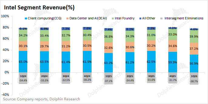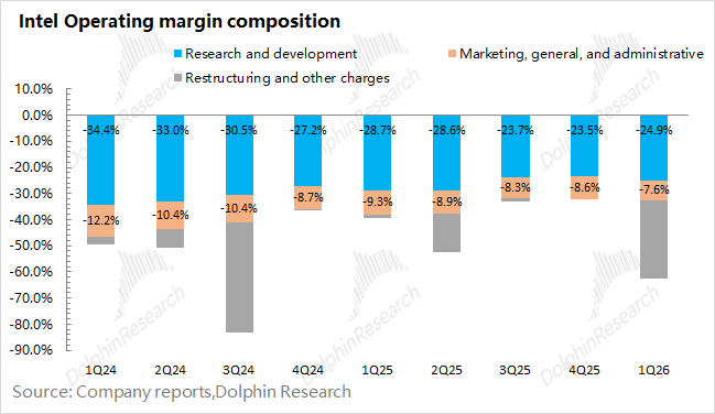 Intel anticipates a gross margin (GAAP) of 37.5% for the next quarter, better than market expectations of 34.7%. The sequential decline in gross margin next quarter is mainly due to the absence of first-quarter inventory gains in the second quarter and the initial stage of 18A mass production. Dolphin Research believes that the impact of server CPU price hikes this time was better than the market's original expectations. Driven by server CPU price hikes and 18A mass production ramp-up, the company's gross margin is expected to rise again subsequently.