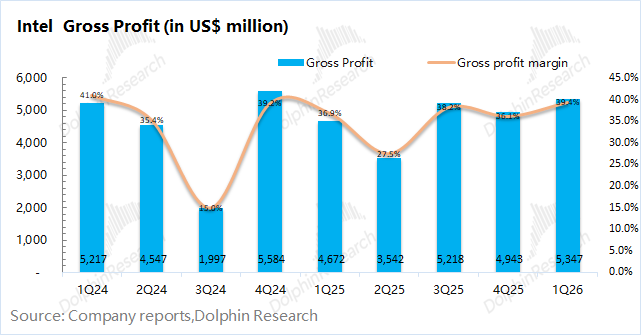 1.2 Gross Profit and Gross Margin: Intel achieved a gross profit of $5.35 billion in the first quarter of 2026, up 14% sequentially. The gross margin for this quarter was 39.4%, up 3.3 pct sequentially, significantly exceeding market expectations of 32.5%. The improvement in gross margin was mainly driven by server CPU price hikes and yield enhancements.