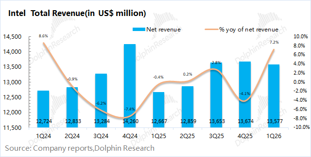 1.1 Revenue: Intel achieved revenue of $13.6 billion in the first quarter of 2026, up 7% year-on-year, significantly surpassing the guidance range ($11.7-12.7 billion), primarily driven by increased demand for server CPUs and product price hikes.