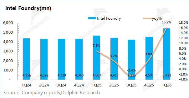 c) Intel Foundry Business: Revenue in this segment amounted to $5.42 billion, up 16% year-on-year. Although Intel's 18A process has entered mass production, foundry revenue this quarter was primarily derived from Intel 7. External foundry revenue was around $170 million, mainly serving Intel's internal products.