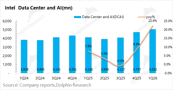 Previously, the company's Data Center & AI revenue hovered around $4 billion. As model development transitioned from training to inference, Intel's AI business (centered on server CPUs) has demonstrated noticeable improvement.