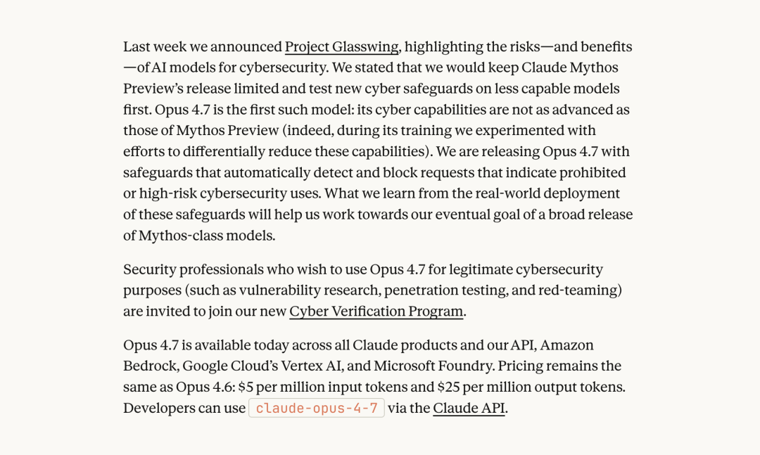 However, because Mythos Preview was deemed too powerful, Anthropic believed that releasing it hastily 'would have serious consequences for the economy, public safety, and national security,' so they decided to only open it up to a few partners for testing temporarily. The newly released Opus 4.7 was a version with intentionally reduced cybersecurity capabilities.