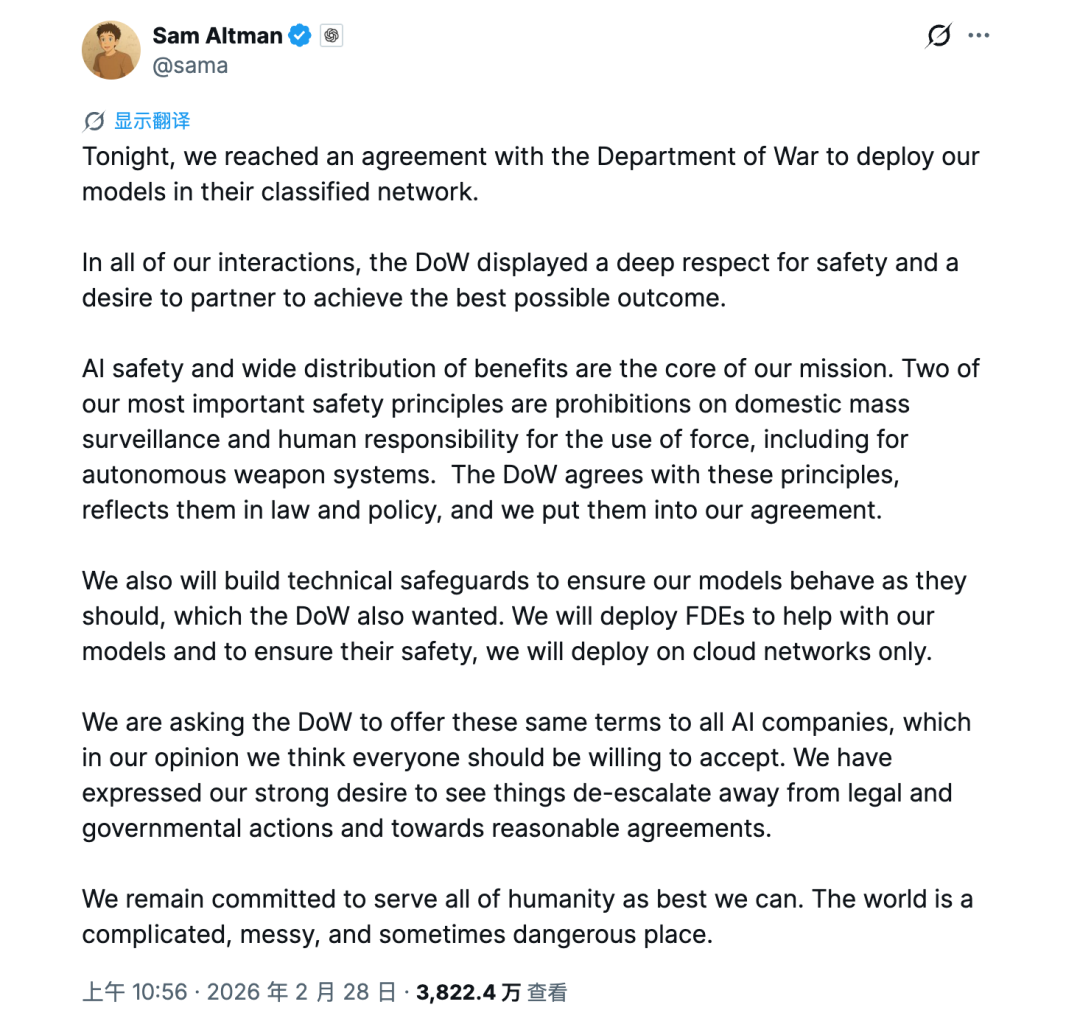 For example, earlier this year, Anthropic clashed with the U.S. Department of Defense, leading to a breakdown in negotiations and a subsequent ban by the Trump administration, resulting in the loss of hundreds of millions of dollars in contracts. Shortly after, the Trump administration directly designated Anthropic as a 'supply chain risk.' This was the first time a U.S.-based company had been designated as such, and Dario Amodei, who was full of Chinese threat theories, finally got a taste of what it's like to be a Chinese company. Trump's original words were cruder: 'I fired (them) like dogs.'""Logically speaking, facing the iron fist of the Trump administration should have been a moment for U.S. AI colleagues to unite and fight against the evil capitalist government. But just hours after Anthropic's negotiations broke down, Sam Altman announced that OpenAI had reached a cooperation agreement with the U.S. Department of Defense. OpenAI even emphasized in its press release that compared to Anthropic's previous cooperation agreement, their solution had more safety measures in place.