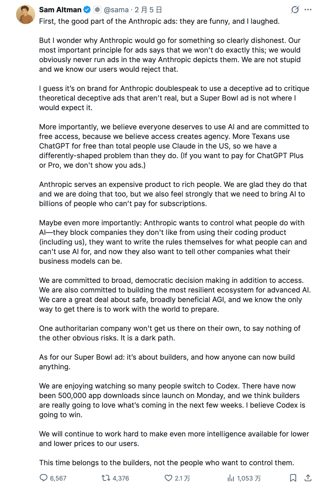 Sam Altman, without being provoked, updated a lengthy tweet on X, emphasizing, 'We obviously won't place ads in the way Anthropic depicted.' He said that using a misleading ad to criticize non-existent, hypothetical misleading ads was very much in line with Anthropic's usual double standards.