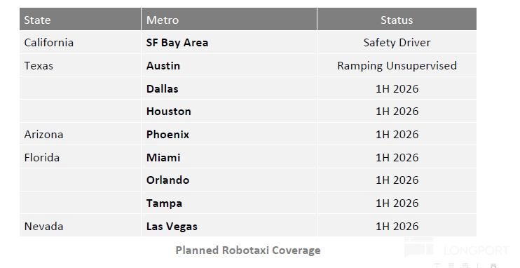 a. Steady Regional Expansion: Robotaxi has expanded to Dallas and Houston, targeting unsupervised operations in over a dozen states by year-end.