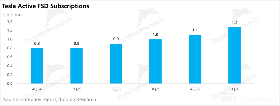d. FSD Subscriptions: FSD now has nearly 1.3 million global paying customers. Since February 15, 2026, Tesla has eliminated one-time FSD purchase options worldwide, fully transitioning to a monthly subscription model (currently priced at $99/month). This policy drove subscription users to become the primary growth driver.