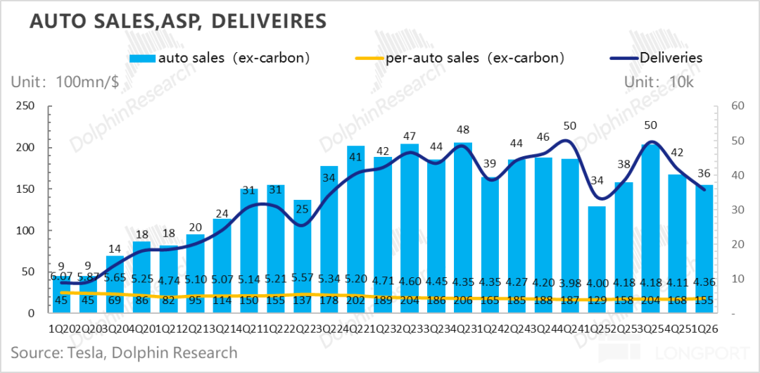 After excluding the aforementioned one-time factors, the actual core automotive gross margin for the quarter was approximately 17.5%. Although this was slightly down from the previous quarter's 17.9%, it was still significantly higher than market expectations. Dolphin Research believes this was primarily driven by a sequential rebound in average selling prices (ASPs) and increased recognition of high-margin FSD revenue, offsetting the rise in per-unit amortized costs due to lower sales volumes and the adverse impact of rising upstream raw material costs.