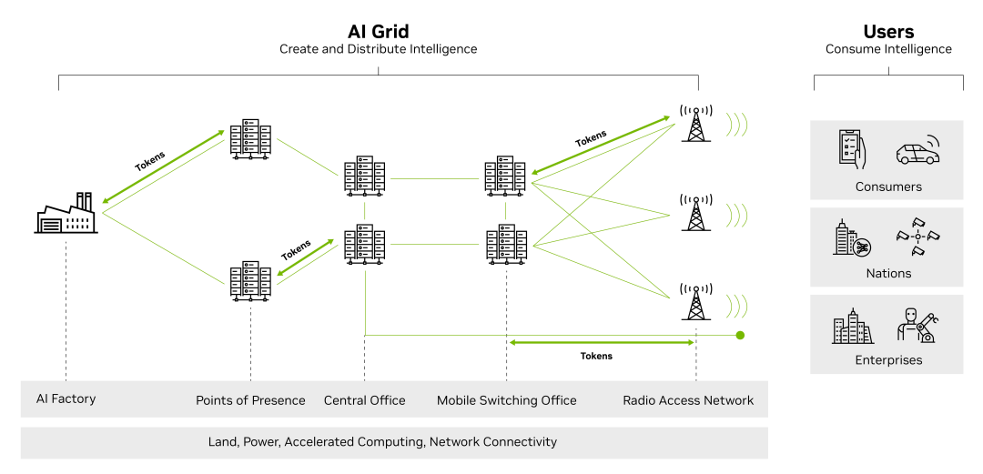 The so-called 'AI Grid' is a network composed of interconnected AI infrastructure nodes, covering AI factories, regional access points, central computer room s, mobile switching centers, and base station sites. These nodes are equipped with full-stack AI infrastructure and connected via secure, high-bandwidth, low-latency networks, enabling seamless flow of data, models, agents, and workloads, allowing the entire grid to function like a unified distributed system.