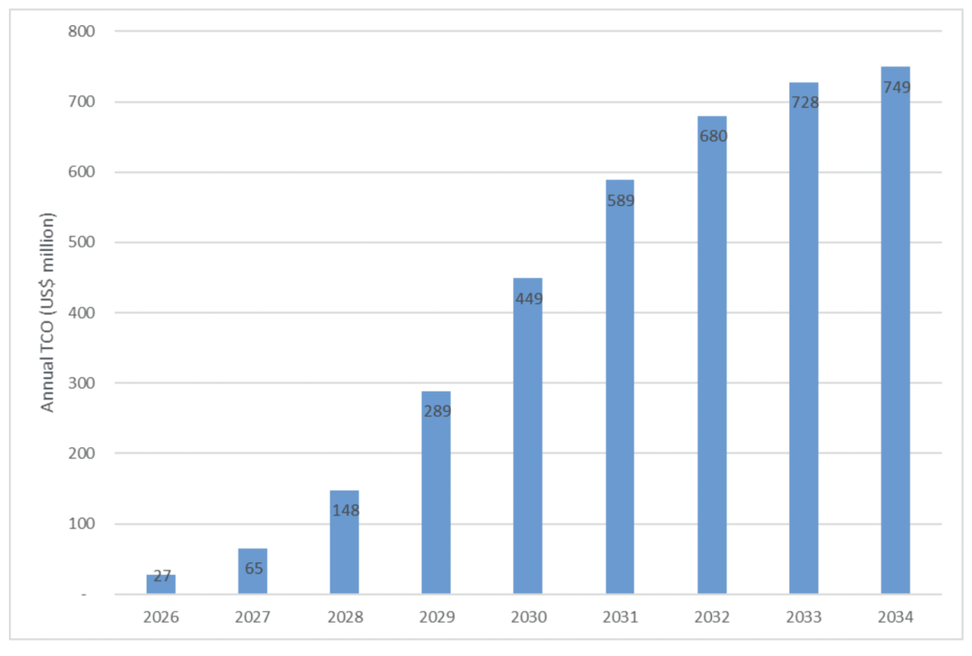To ground the discussion in real data, ABI conducted a simulated calculation using T-Mobile US as an example. T-Mobile US stated at the GTC conference that 'kinetic tokens' would present a massive opportunity for global telecom operators. To leverage its infrastructure assets, operators would need AI-RAN systems and GPU deployments in their networks. Assuming T-Mobile US operates approximately 13,000 rooftop base station sites in the U.S. and begins equipping them with AI-RAN servers (using NVIDIA's ARC-1 server, priced at $60,000 each, with each server providing compute power for three base stations), with deployment completed by 2035 to achieve full GPU coverage at rooftop sites—the cumulative total cost, including deployment, cooling, and other ancillary costs, would reach $3.7 billion. The chart below shows the annual total cost of ownership for this example deployment scenario: