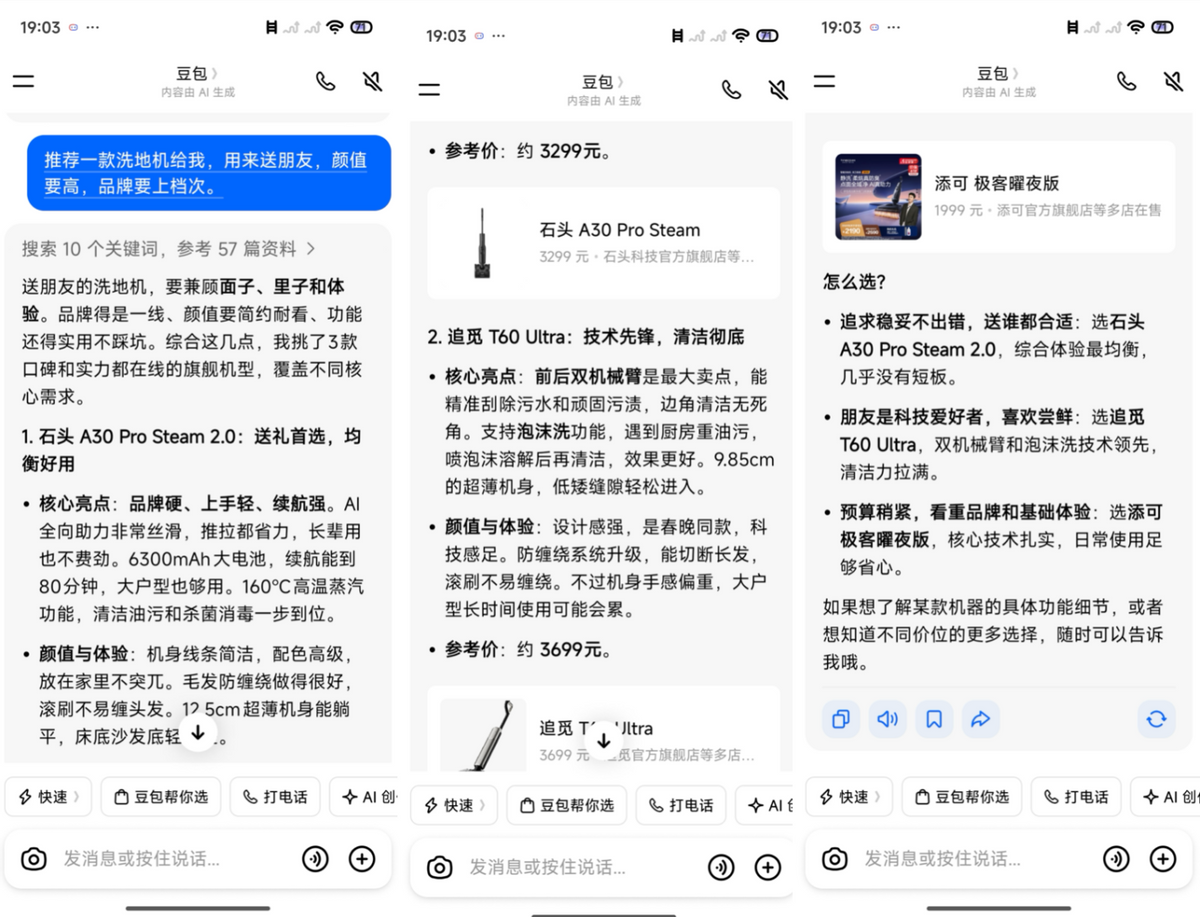 After testing it out, I found that "Help You Choose" is an AI-powered shopping guide centered around conversational interaction. For instance, if I tell Doubao, "Recommend a floor-cleaning machine as a gift for a friend. It should have a premium look and be from a reputable brand," the AI swiftly gathers information, analyzes the requirements, lists the pros and cons of different products along with price comparisons, and then provides personalized recommendations—a capability shared by many AIs. However, the key difference is that Doubao displays product cards in its results, allowing users to place orders with a single click.