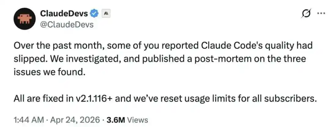 This narrative holds. But commercially, another truth applies: Anthropic waited six weeks to admit Claude Code’s decline, timing the confession to OpenAI’s new release. Without peer pressure or Opus 4.7 proving “we have reserves,” this statement might never have come.