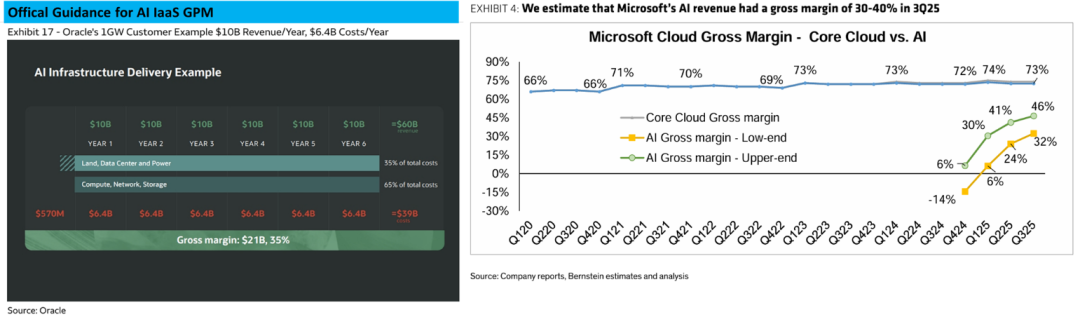 Is this guidance reasonable and credible? Let's compare it horizontally: a. CoreWeave, whose business composition and cost structure are very similar to Oracle's AI computing power business, has a steady-state gross margin of approximately 25%, according to our previous calculations. b. According to Bernstein's forecast, Microsoft's gross margin for AI cloud revenue in Q3 2025 (calendar year) is approximately 30%-40%.