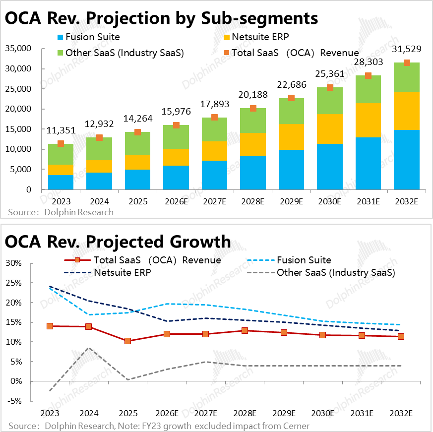 In terms of specific forecasts, considering that the revenue growth rates for Fusion and Netsuite ERP businesses have remained at 15%–25% over the past 2–3 fiscal years, showing strong momentum, and that Oracle is indeed a leader in back-office management systems, Dolphin Research's basic assumption is that the Strategic Back-Office product line will maintain a compound annual growth rate of about 15%–16% from FY26 to FY30, driving the overall OCA segment's revenue to grow at an average rate of 12% during the same period.