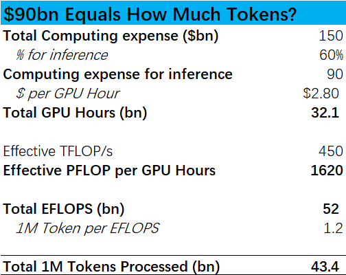 After some calculations, $90 billion in inference expenditures can roughly correspond to 400-450 billion million Tokens output (see the table below for details; due to many assumptions, this is only for reference on an order of magnitude). Referencing assumptions used in the market, if light users consume 10 million Tokens annually, this can support 4 billion light users globally; if heavy users (such as Agent users) consume 500 million Tokens annually, this can only support over 8 million users.