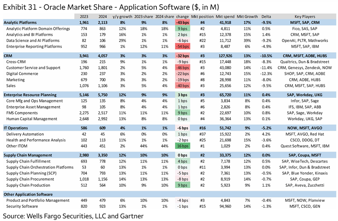 Cross-referencing industry data, Oracle is indeed a leader in the back-office management system segment within the software application space, with market share generally ranking in the top 3. As shown in the table below, Oracle ranks second or third in market share for the three main modules of CRM, ERP, and SCM, behind only SAP and Salesforce, the two largest leaders. However, Oracle ranks relatively lower in modules such as Analytics and IT Operations, showing a clear contrast in strengths and weaknesses.