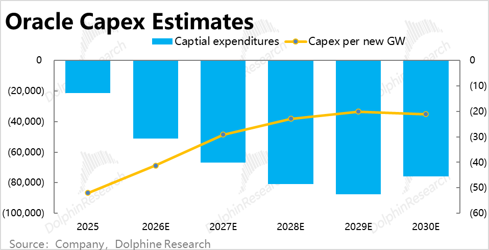 Given Oracle's recent statement that 'in some customer collaboration projects, it will rely on customer advance payments to purchase equipment or have customers directly purchase GPUs for Oracle,' Dolphin Research believes that Oracle's actual Capex per new GW is likely to be lower than previous guidance. In our forecast, we assume $20 billion per GW.