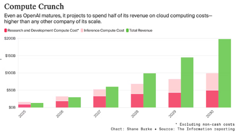 First, according to Information's forecast at the end of 2025, OpenAI aims to achieve $200 billion in annual revenue by 2030, with total computing power expenditures reaching approximately $100 billion, with inference and training expenditures each accounting for about 50%. Using this as a reference, Oracle's current contract with OpenAI (annual $60 billion) actually accounts for approximately 60% of OpenAI's total computing power expenditures by 2030.