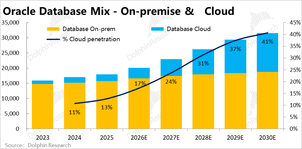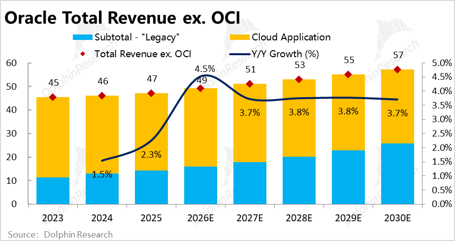 So, what situations might cause actual revenue to deviate from these basic assumptions? Dolphin Research believes the main scenarios are: a. Negative scenario: Rapid evolution of AI quickly replaces traditional commercial software, causing the company's traditional software business and even SaaS business revenue to actually plummet rather than decline gradually; b. Optimistic scenario: Oracle attracts new customers and generates cross-selling through the explosive growth of its OCI business, driving a recovery in the growth of 'foundation' businesses.