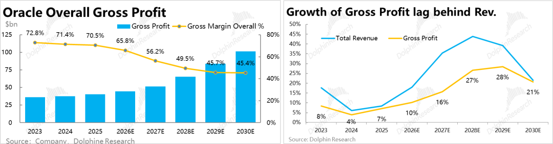 In terms of specific forecasts, based on the assumption that the gross margin of the non-AI portion of Core OCI remains roughly stable at just over 40%, while the gross margin of the AI portion turns positive for the first time in FY27 and approaches 30% by FY30, Oracle's overall gross margin is projected to decline from just over 70% in FY25 to around 45% by FY30.