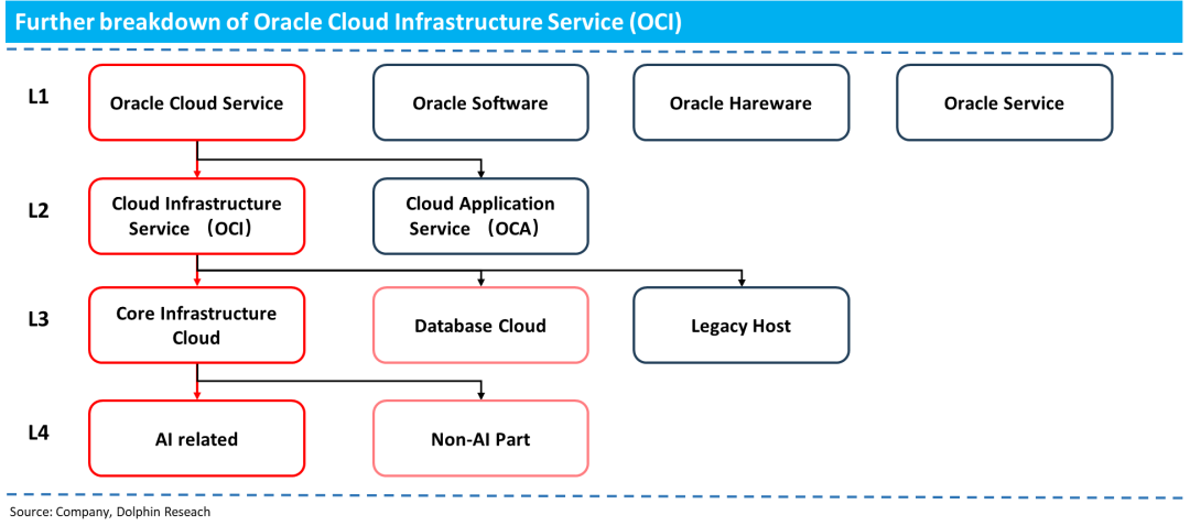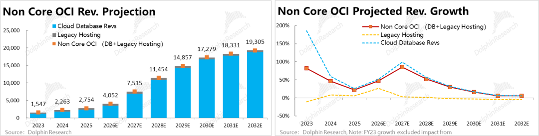 Next, let's further understand and break down the most critical OCI segment. Based on relevant research, OCI can be further divided into three sub-segments—Legacy business, Cloud Database (Database) business, and Core OCI business—i.e., the narrowly defined IaaS computing power leasing business (correspondingly, we classify Legacy + BD Cloud as non-core Non-Core businesses). Specifically: