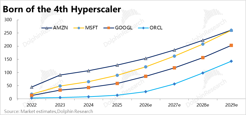 b. From a dynamic perspective, referencing recent market expectations, OCI's revenue volume by FY30 (including IaaS + databases + Legacy) will approach Google Cloud's total revenue and be equivalent to 50%-55% of AWS and Azure's revenue scales. This implies that by FY30, Oracle will officially become the fourth cloud computing Hyperscaler.