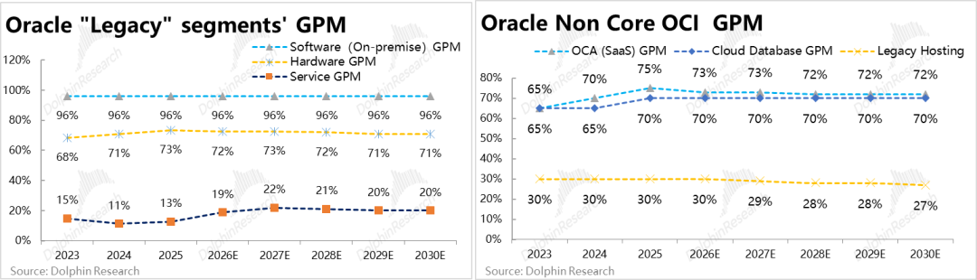 In summary, product lines outside of Core OCI can be categorized into three groups: a. Traditional software business has the highest gross margin, exceeding 90%, aligning with the business model of selling software licenses with nearly zero marginal costs. b. OCA SaaS business, hardware business, and the data cloud within the OCI segment generally have gross margins around 70%. c. The Legacy Hosting and consulting segments within the OCI segment have gross margins around 20%-30%.