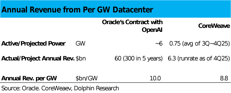 This can be verified by the earlier calculation showing that CoreWeave generates approximately $8.8 billion in revenue per GW, while Oracle generates about $10 billion. On the other hand, although their cost structures are similar, Oracle's significantly larger business scale should also provide some economies of scale advantages.