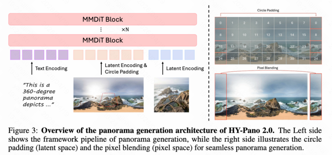 Panoramic Generation: HY-Pano 2.0, employing a Multimodal Diffusion Transformer (MMDiT) and cyclic padding with pixel blending strategies.